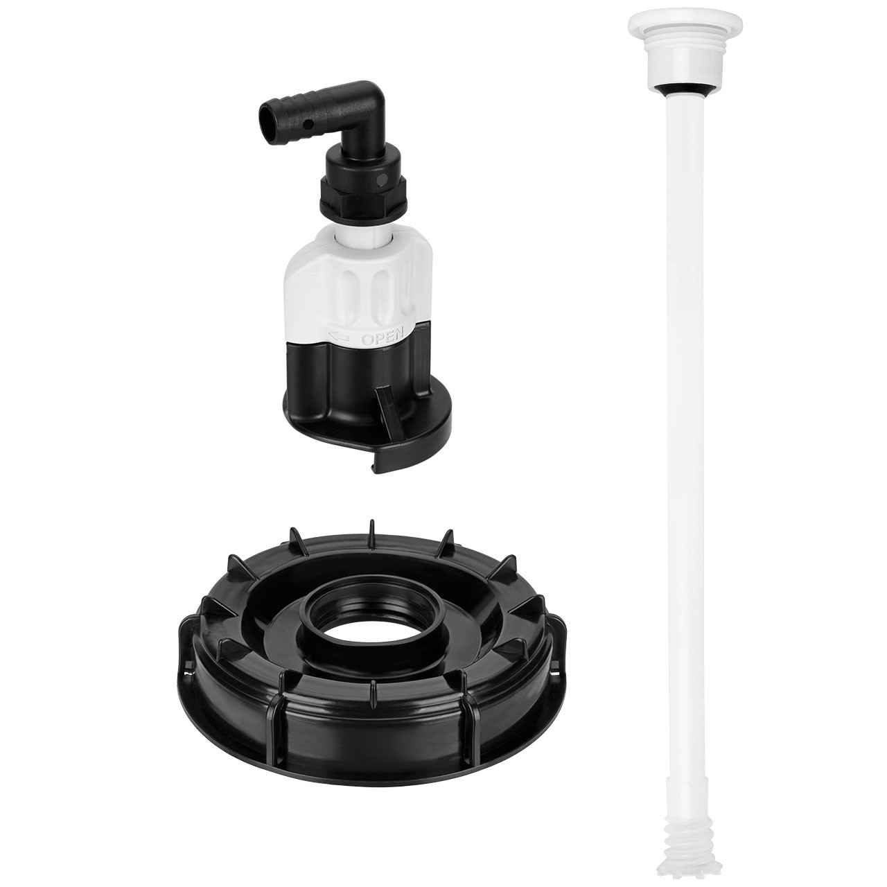 Der Deckeleinlauf beider Ausführungen ist mit einem vormontierten und abgedichteten 87° HT-Bogen oder einem geraden HT-Rohr in den Varianten mit Einlauf in DN 50, DN 75 oder DN 110 mit oder ohne Filterkorb verfügbar. Des Weiteren bieten wir noch spezielle Deckel mit Be-und Entlüftungsventil, Überlaufdeckel bzw. Fallrohreinlaufsets für den Anschluss vom Fallrohr zum Intermediate Bulk Container an. Auch Originalersatzteile von SCHÜTZ wie Spundlochstopfen oder Ersatzdichtungen für Ihre Schraubkappe finden Sie in unserem Angebot.